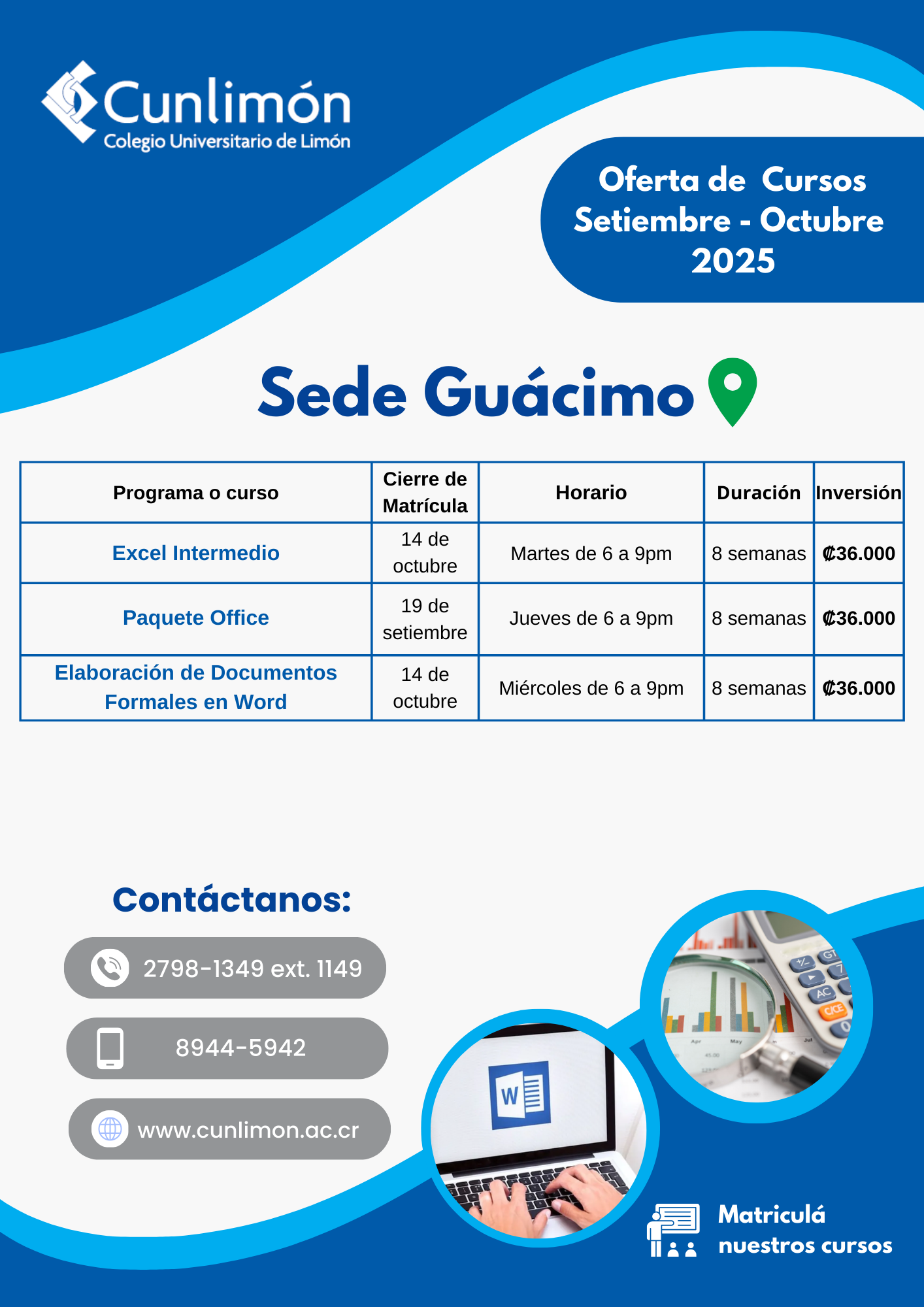 Además, se enseñará cómo dar formato a las celdas, configurar adecuadamente la hoja de trabajo y crear gráficos sencillos que faciliten la visualización de la información. El curso está dirigido a personas mayores de 15 años con conocimientos básicos en computación, que deseen fortalecer sus habilidades para el estudio, el trabajo o el emprendimiento.