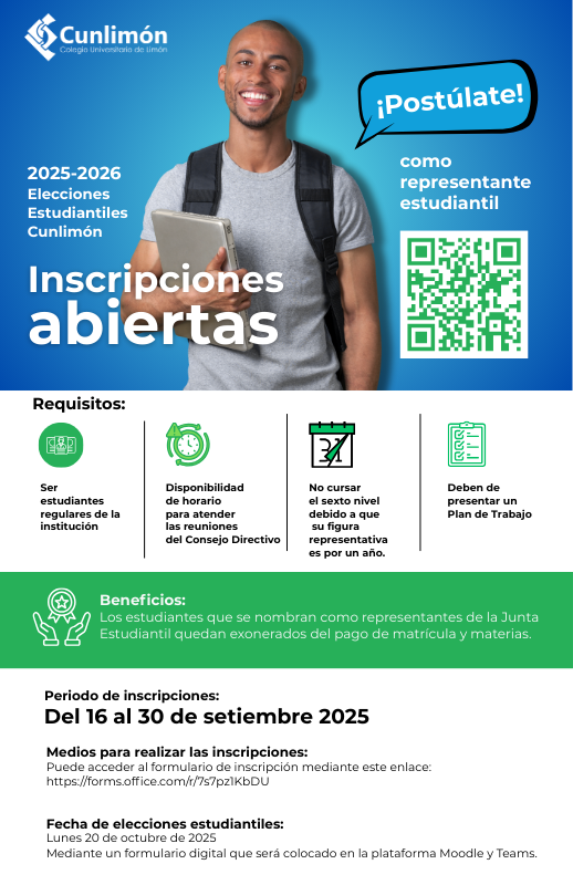 El Colegio Universitario de Limón (Cunlimón) les invita a ser parte activa del proceso electoral para elegir al Tribunal Electoral Estudiantil (T.E.E. CUNLIMÓN).